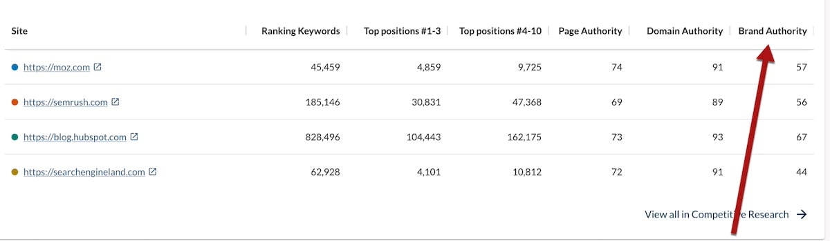 Brand Authority helps evaluate and compare a brand’s strength to competitors’. It’s handy for diagnosing ranking losses and gauging viral marketing and public relations campaigns.