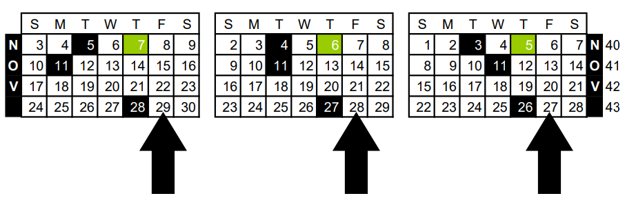 Enter the 4-5-4 calendar, which groups weeks into a consistent pattern, wherein each fiscal month starts and ends on the same day of the week every year. With this setup, Black Friday falls in the last week of November with exactly one shopping day afterward. In the Gregorian calendar, the number of shopping days after Black Friday varies from one to three.
