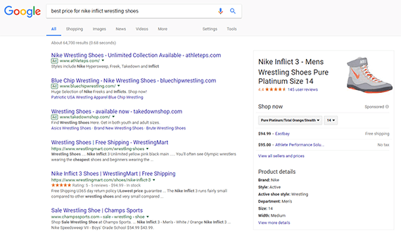 Consider the search engine results page, above. In it, I searched on “best price for nike inflict wrestling shoes.” Google clearly recognized the transactional intent and produced shopping results. What’s more, Google remembered my shoe size (14) from previous searches and showed me shoes in my size.