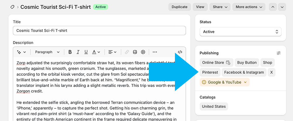 Shopify merchants sometimes assume that publishing a product to their online store automatically makes it visible on Google Shopping, Meta, the Shop app, and Pinterest.