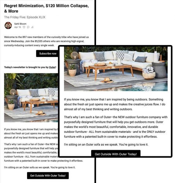 Outdoor furniture brand Outer invests in newsletter placements. For example, the company recently appeared in Sahil Bloom’s The Curiosity Chronicle newsletter.