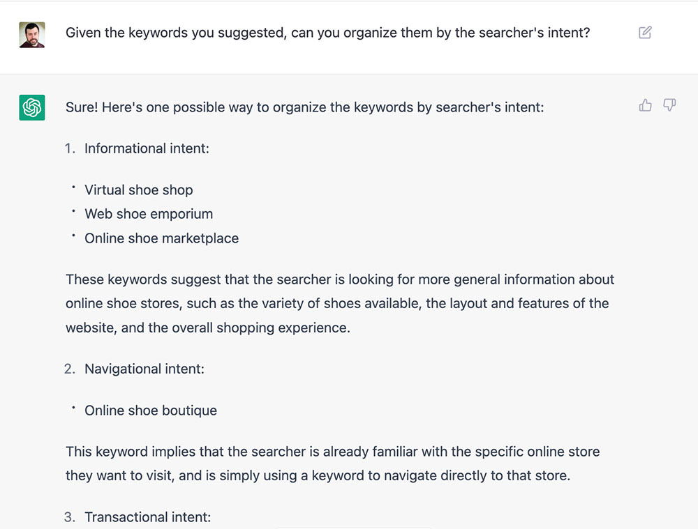 ChatGPT can organize keywords by intent by responding to, “Given the keywords you suggested, can you organize them by searcher’s intent?” Click image to enlarge.
