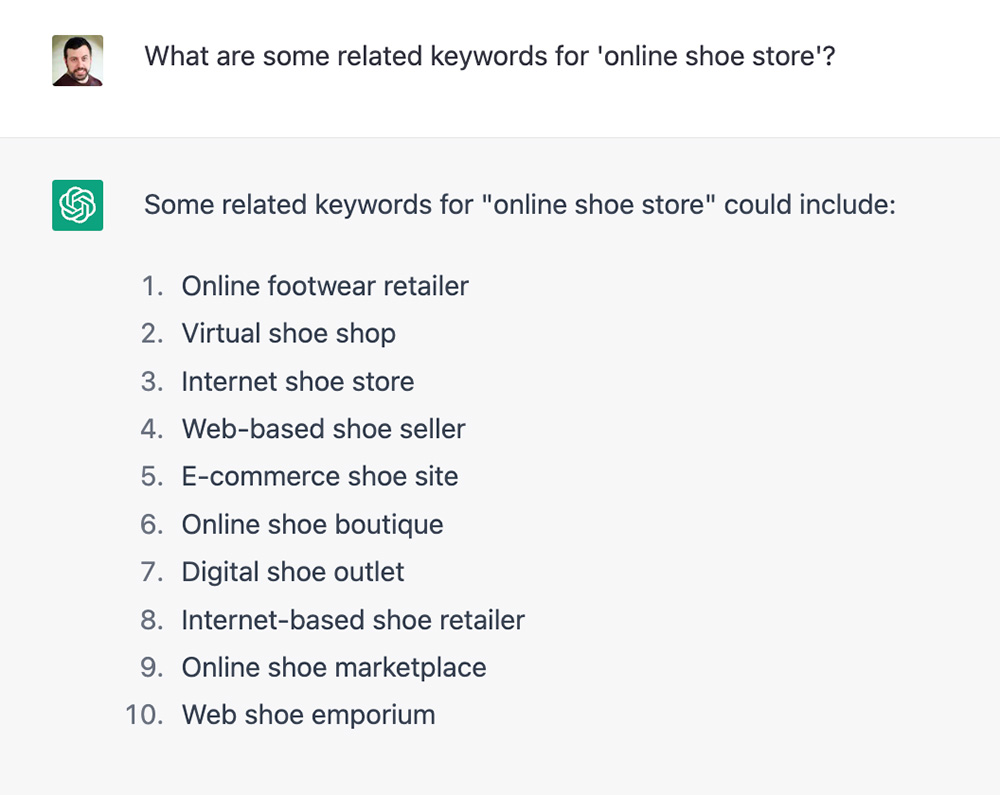 Generating keyword ideas is a straightforward use of AI-powered chat. Ask the chat tool, “what are some related keywords for ‘online shoe store’?” and it might suggest terms such as “buy shoes online,” “discount footwear,” or “online shoe deals.”