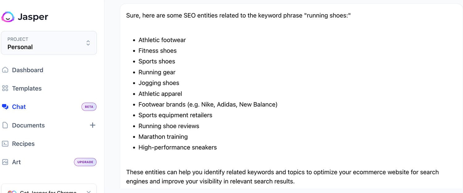 AI chat tools such as Jasper can access Google and use the search results in the response. Thus the tools can help identify SEO entities. As with intent, there is no guarantee that Jasper is correct, but the suggestions point the search optimizer in the right direction.