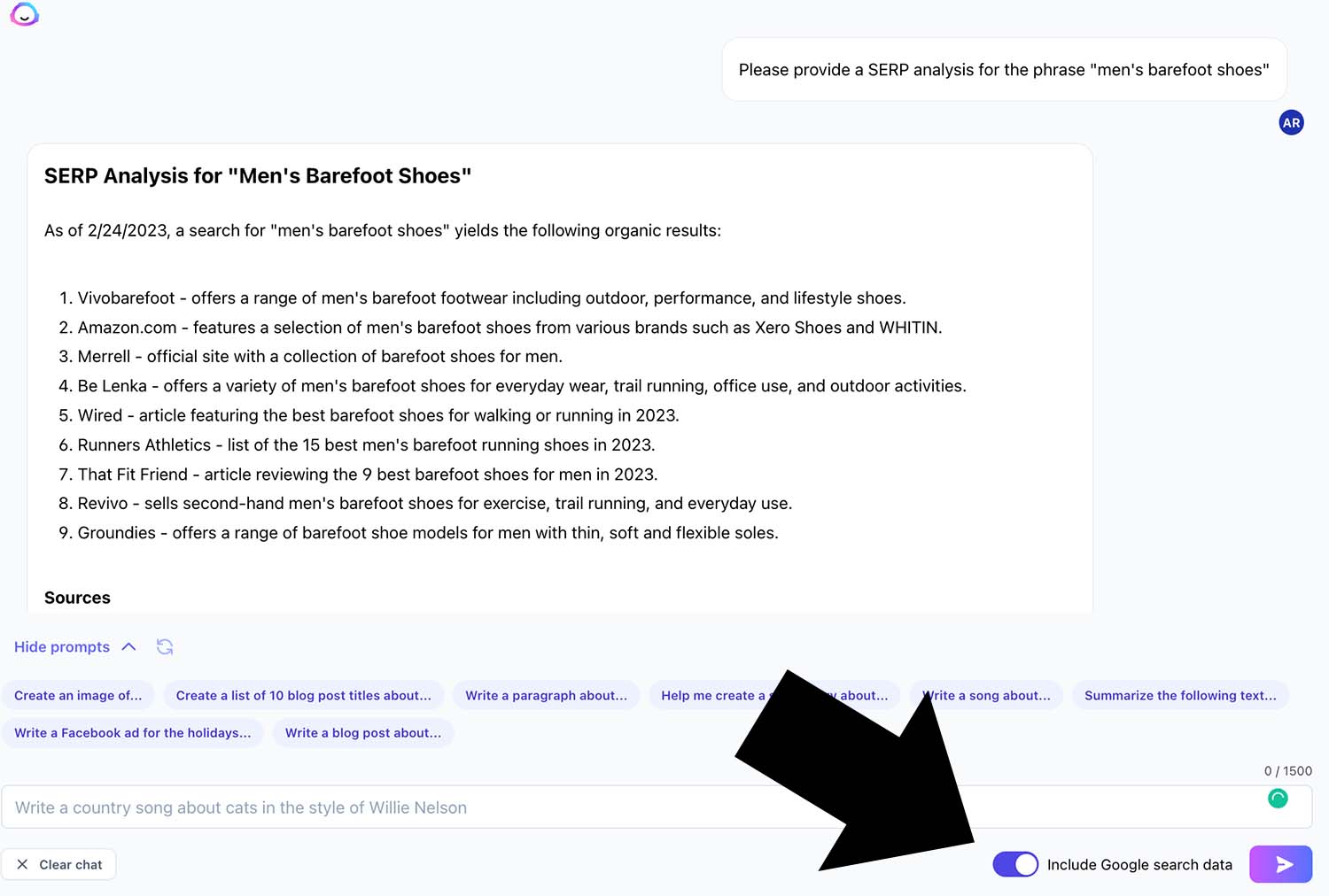 Ask something like “provide a SERP analysis for the phrase ‘men’s barefoot shoes,'” and Jasper or a similar tool will list the top-ranking pages on that topic — helpful insight into high-performing content.