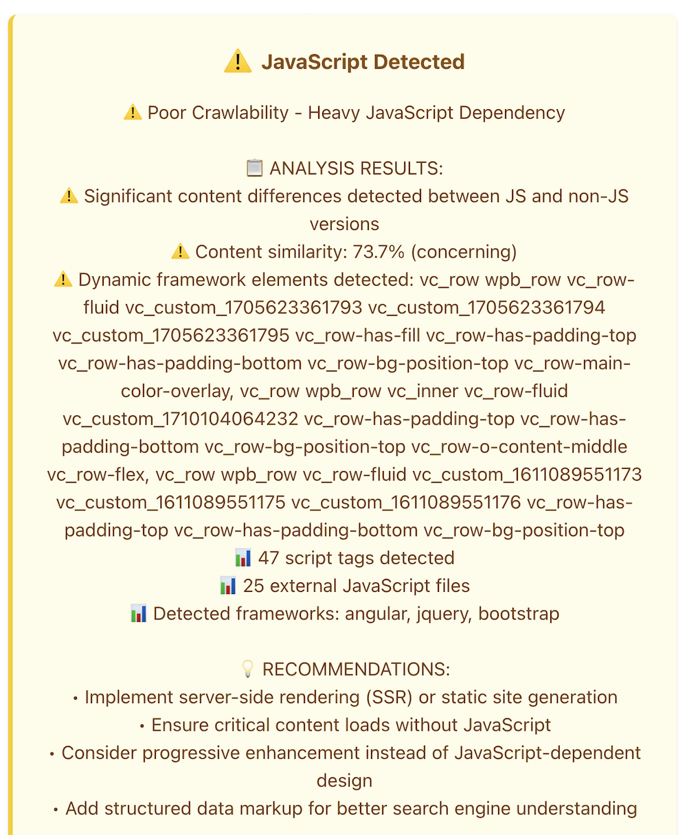The tool will conduct a thorough review with suggestions on improving access for AI crawlers and even show the appearance of pages with JavaScript disabled.