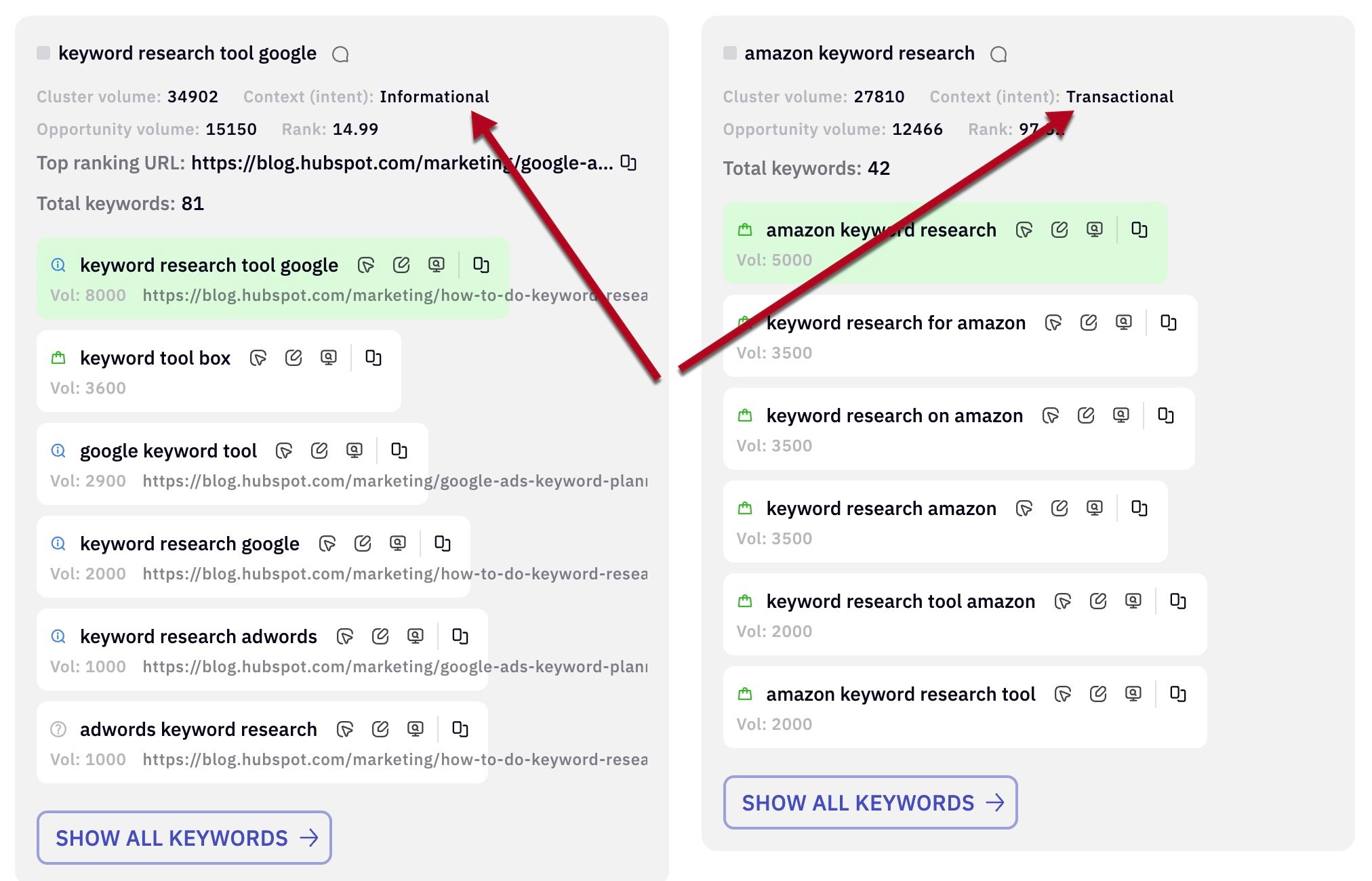 For example, if most of the top 20 results were articles, Keyword Insights would assign a context as “informational.” If the results were product detail pages, the context would be “transactional.”