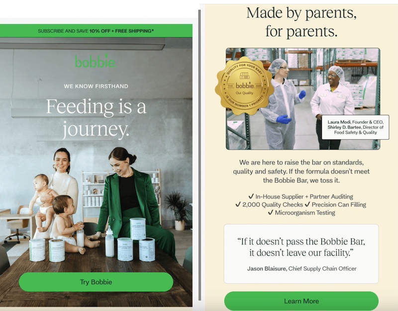 Bobbi, an organic infant formula brand, uses storytelling and social proof to build trust with new moms. The email’s opening sentence — “We know firsthand” — signals that Organic’s founders are also mothers. Multiple calls to action provide engagement options for subscribers to interact at their choosing — without purchasing.