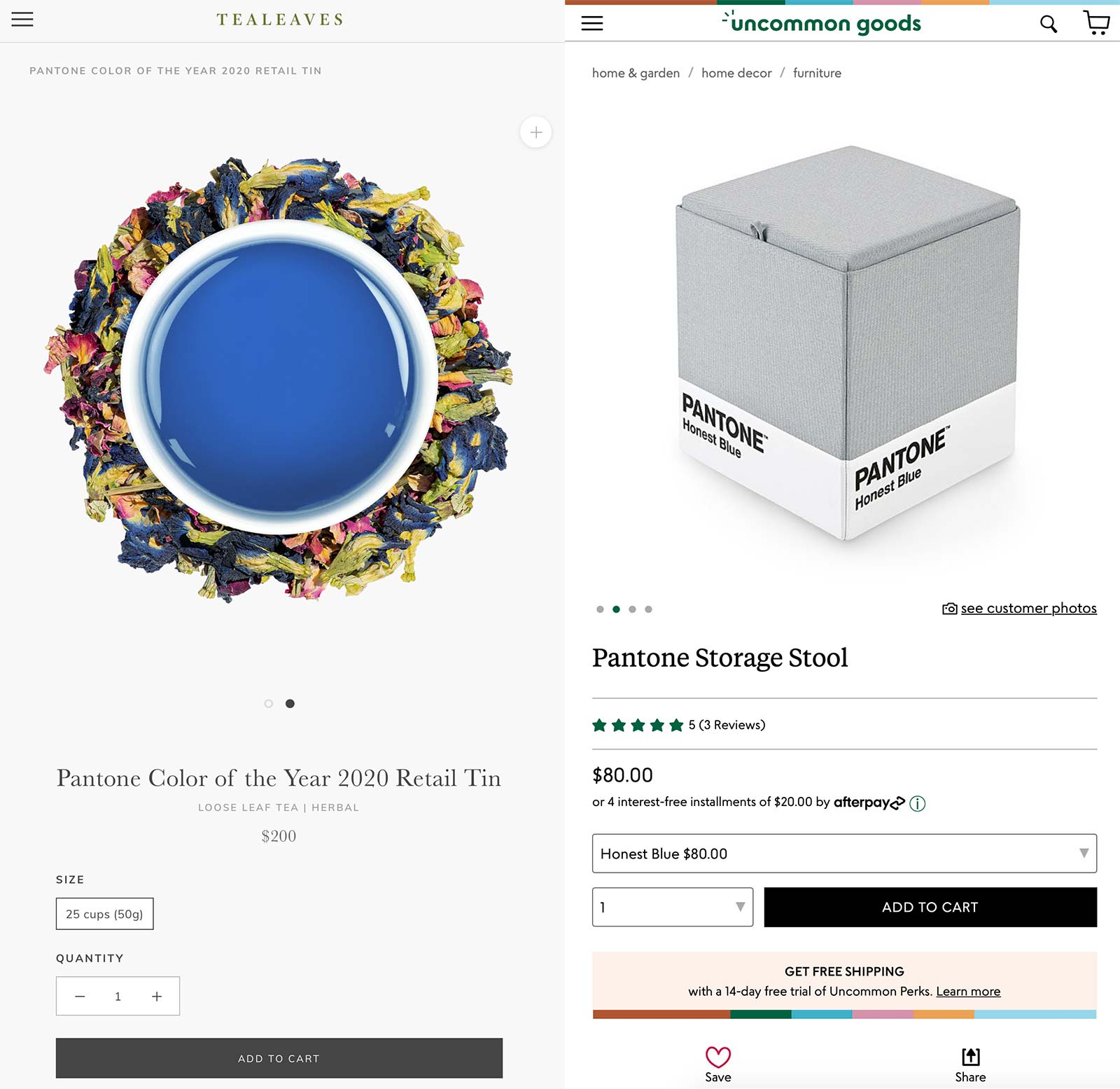 TeaLeaves, at left, produced a tea that turns Pantone Classic Blue when steeped. Uncommon Goods sells stools that mimic Pantone’s colors and block design.