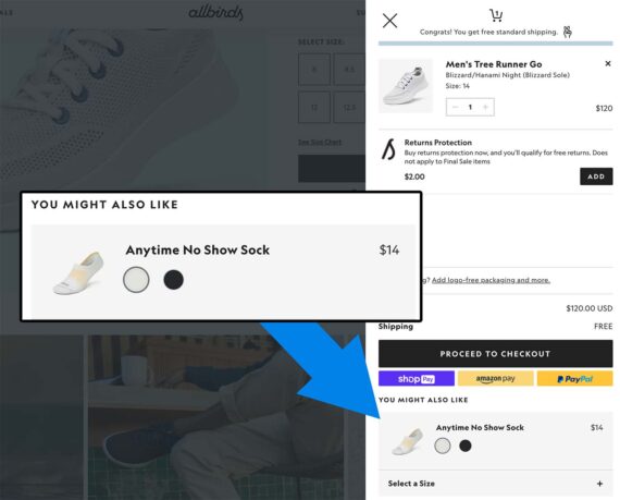 For example, a shopper who adds an item to the Allbirds (shoes) shopping cart sees a modal offering similar items. Allbirds also offers similar items in the checkout process, such as socks for running shoes.