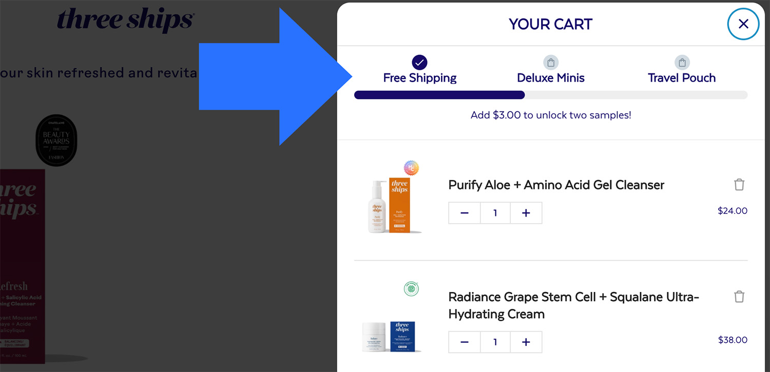 Yet Three Ships, a skincare brand, displayed its threshold-based incentives in the shopping cart. Shoppers receive free shipping at $49.99, free samples at $65, and a travel pouch at $85. (The incentives are cumulative: a purchase of $85 earns all three items.)