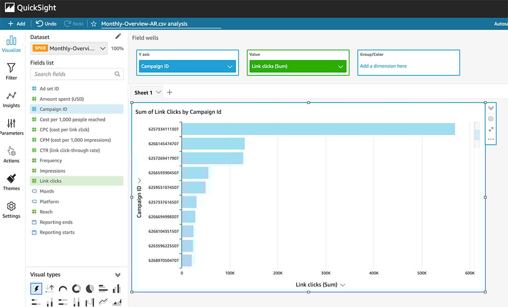 Thus we can already see an advantage of using a BI tool. The Meta report was in a table view. It contained the same campaign data, but that data is much easier to digest as visualized in QuickSight.