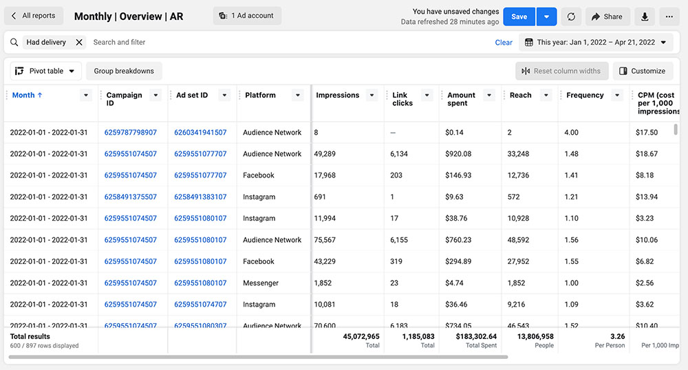 The first step is to create an Ads Manager report containing the fields to import into the tool. For this example, I’ll build a report containing the Month, Campaign ID, Ad Set ID, Platform, and several metrics.