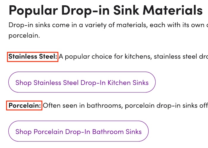 Informational queries do not have buying intent, but the articles and guides should direct searchers to the next steps. Wayfair’s pages include links to other resources and product pages (for purchase). For example, a Wayfair article titled “What Is a Drop-In Sink?” describes the materials and links to product pages of stainless steel and porcelain sinks.
