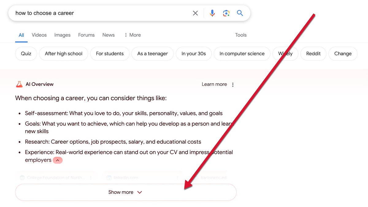 Searching “how to choose a career” produces an AI answer but no immediately visible source link. Click image to enlarge.