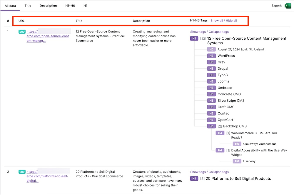 For more ranking opportunities, pull each page’s title tag, meta description, and H1 to H6 headings.