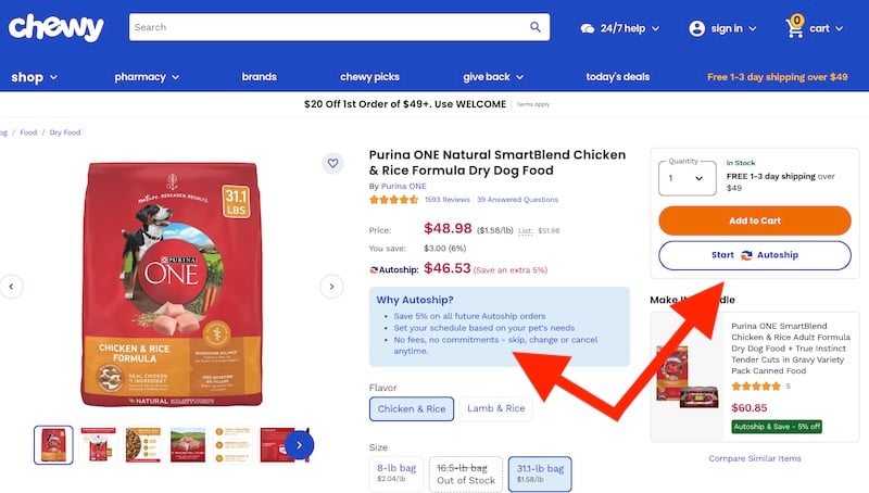 Product sales via subscriptions help merchants and consumers. This example is Chewy’s “Autoship” program for dog food.