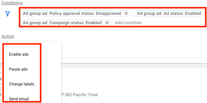 The action is to send an email. Daily emails are suitable for disapprovals — I elect to receive them only for changes or errors. Thus I’ll receive an email only when an ad is newly disapproved.