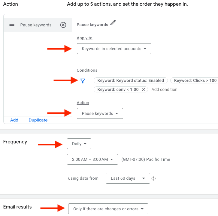 Action: Pause Keywords when “Keyword status: Enabled,” “Keyword clicks > 100,” and “Keyword conversions < 1 using data from the last 60 days.”