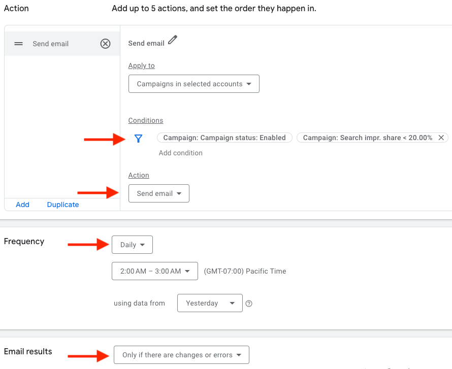 Action: Send email when “Campaign status: Enabled,” “Campaign Search impression share < 20%” using data from yesterday.