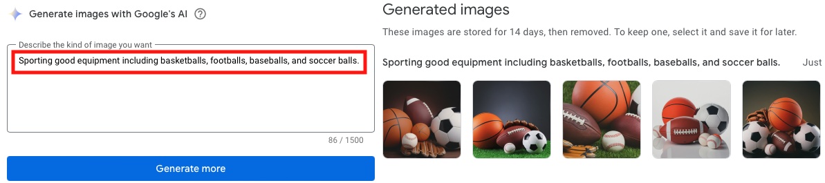 From a description (on the left), Google Ads can create relevant images, such as sporting goods equipment in this example. Click image to enlarge.