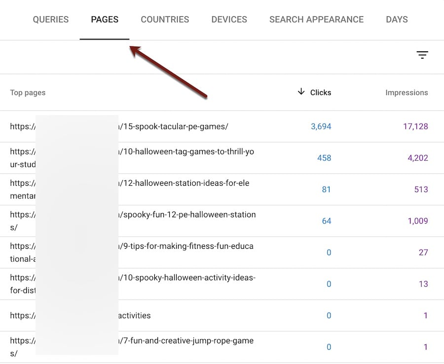 Trending-down keyword groups may need work. Select the keyword group in Search Console to load it in the Performance section. Then click the “Pages” tab. Here you can see the URLs that rank for this cluster.