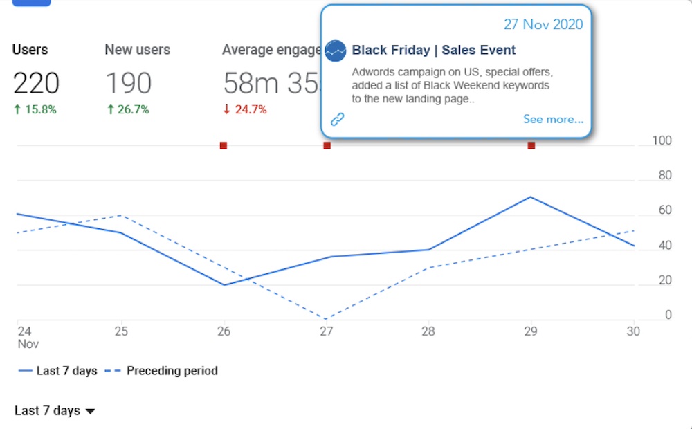 Automated Google Analytics Annotations GA4 add notes to reports to correlate marketing and other changes with traffic. Click image to enlarge.