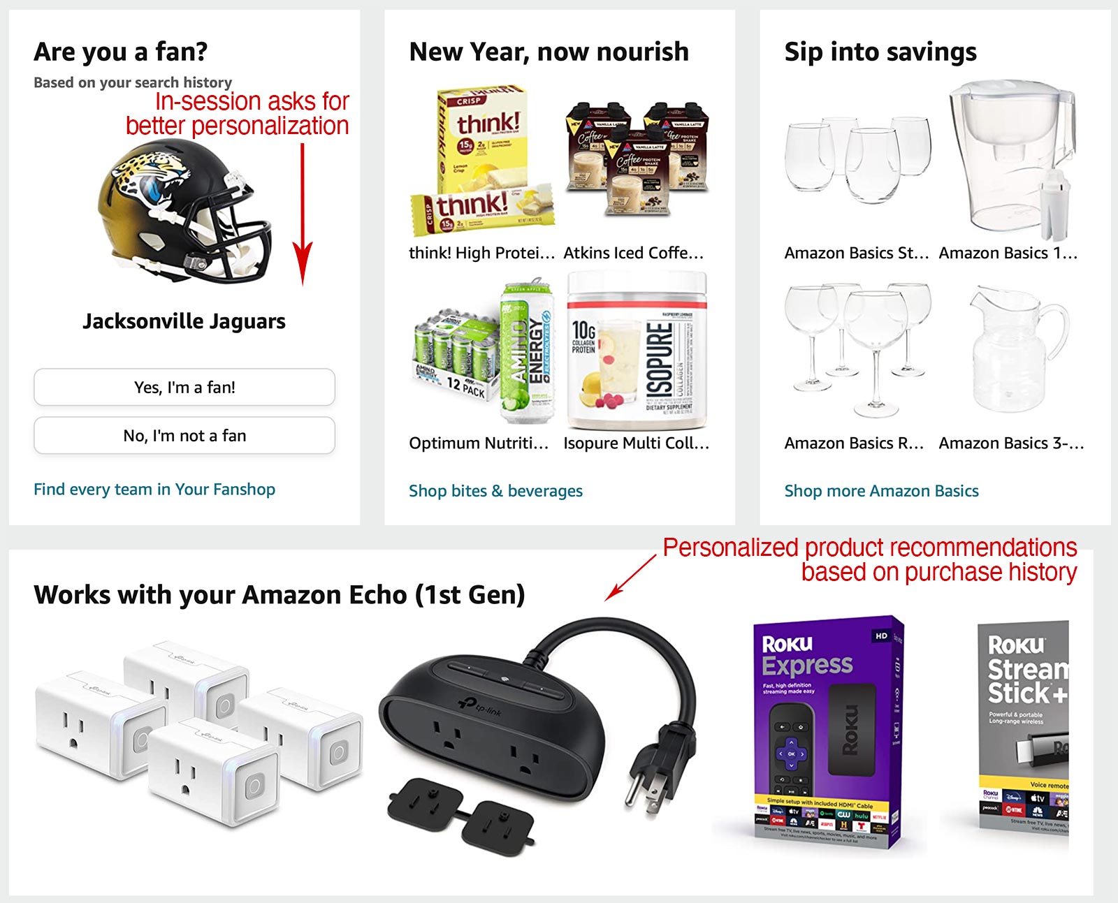 Amazon asks simple questions — such as “Are you a fan?” at top left — to boost sales on specific products.