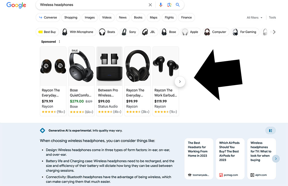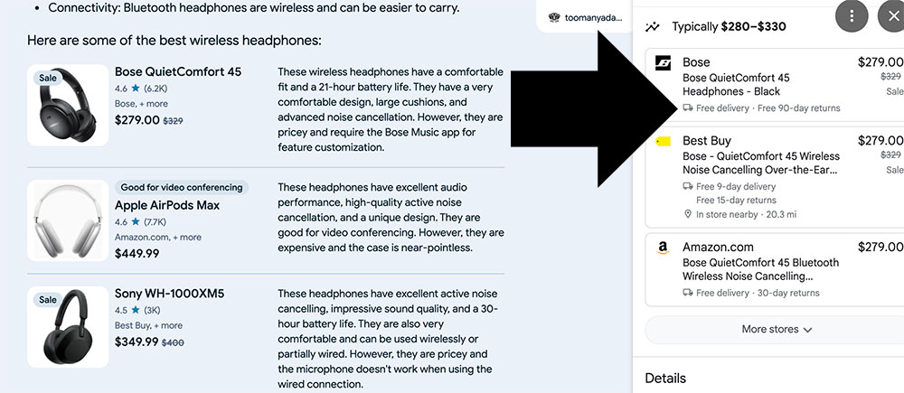 For example, the top SGE result for “wireless headphones” was not a link. Clicking it opened a right-side panel (on a desktop computer) containing links to three online stores.