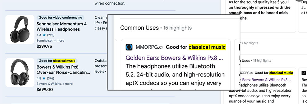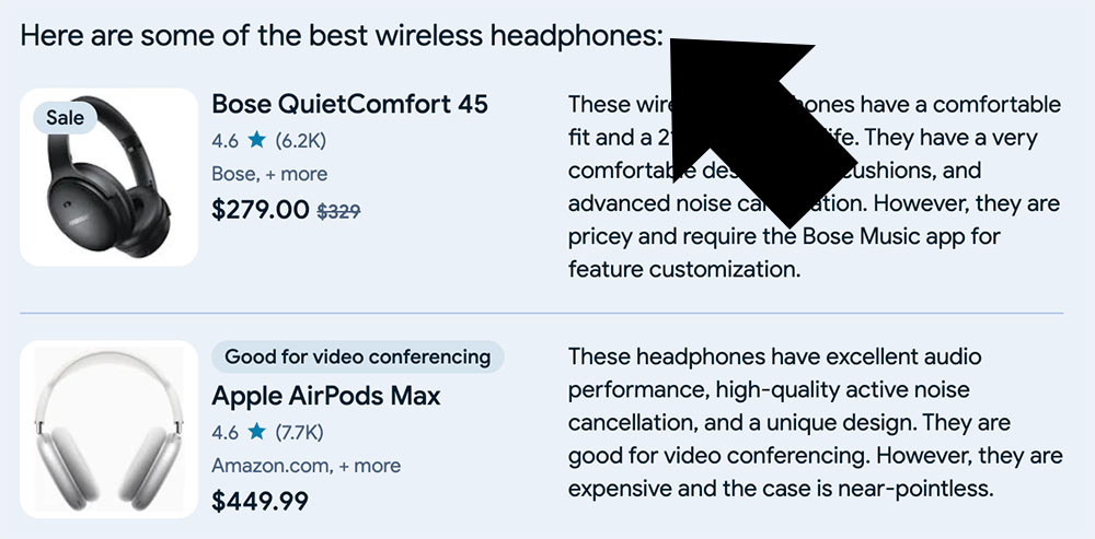 SGE results seem to recommend products with qualitative statements such as “the best wireless headphones.” Click image to enlarge.