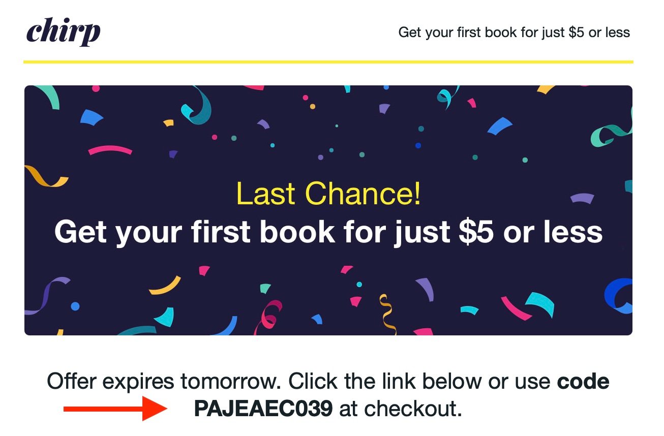 Acquiring customers is one of many uses of coupon codes. This example from Chirp, a seller of discount audio books, is for first-time buyers.