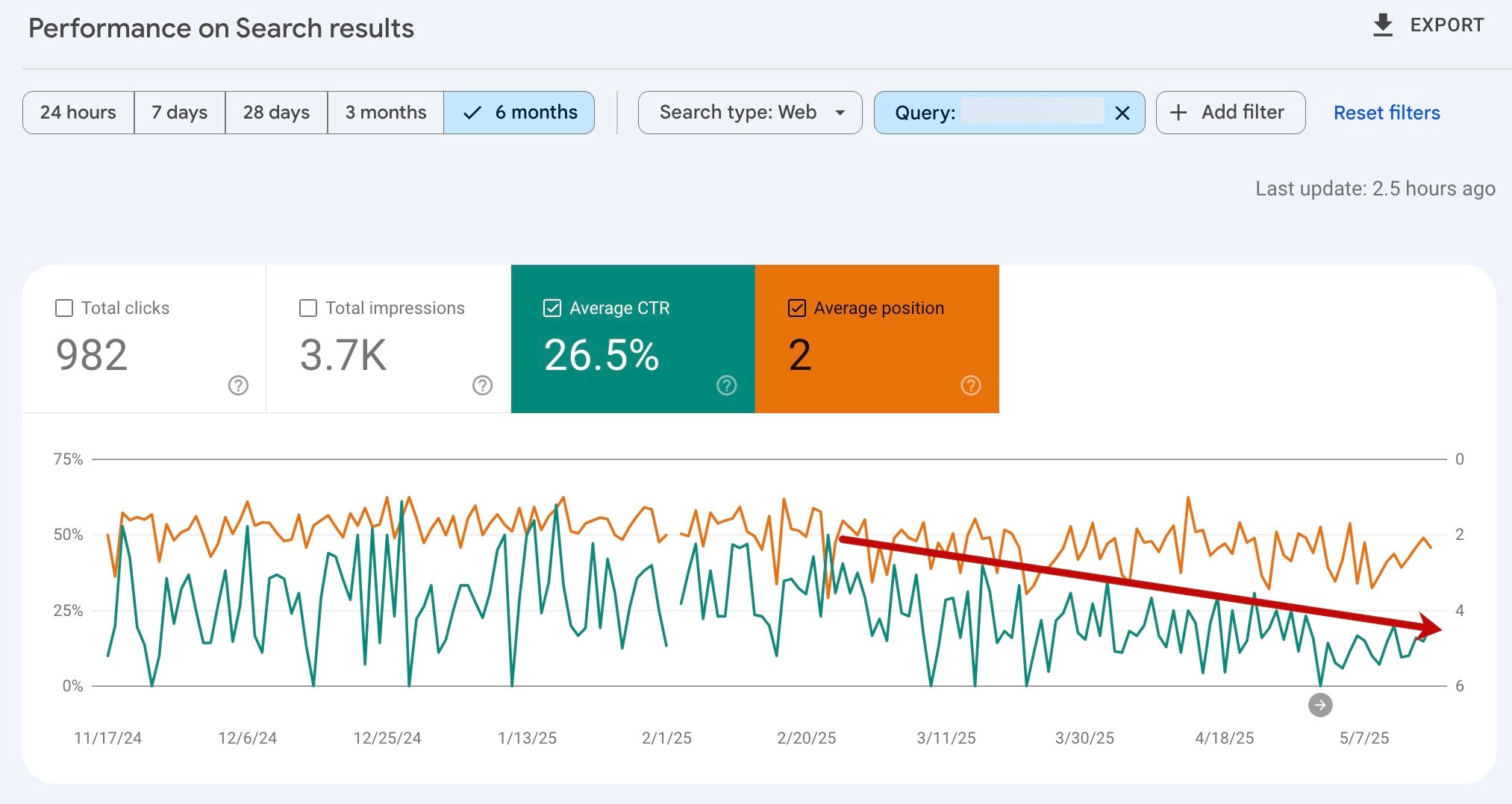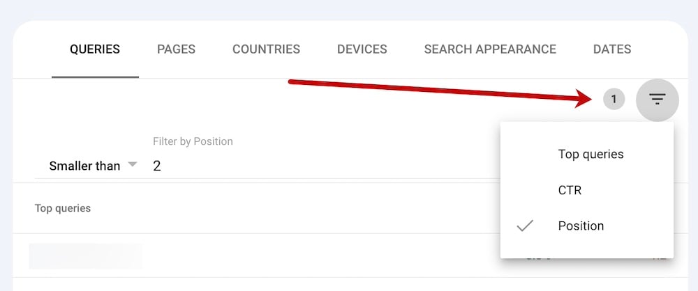 Your report is now filtered for search queries where your site ranks below position 2. This will include average positions — e.g., a site appearing in AI Overviews on mobile but not desktop will have an average position slightly higher than 1.