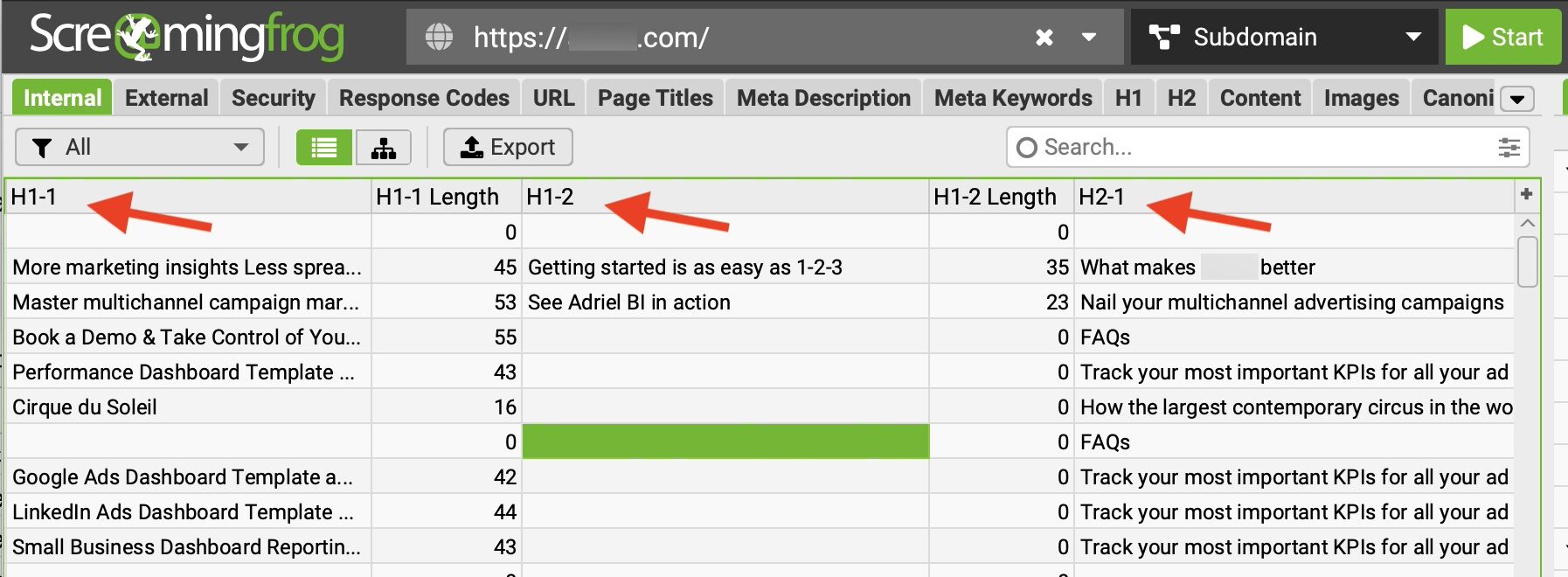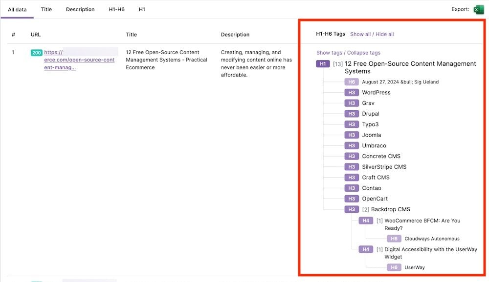 Screaming Frog is a freemium crawler that identifies headings on every page on a site, listing the page URL and the heading type, words, and number of characters.