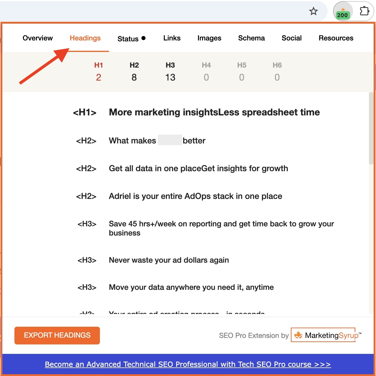 SEO Pro Extension is a free Chrome extension that pulls SEO info — images, links, schema — from any page. It has a dedicated tab for headings, making analysis quick and easy.