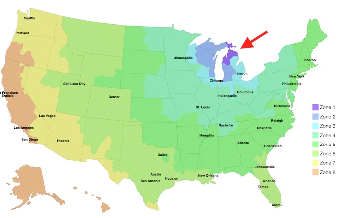 USPS zones are based on the shipping origin. This example map displays zones from Traverse City, Michigan. Source: Endicia.