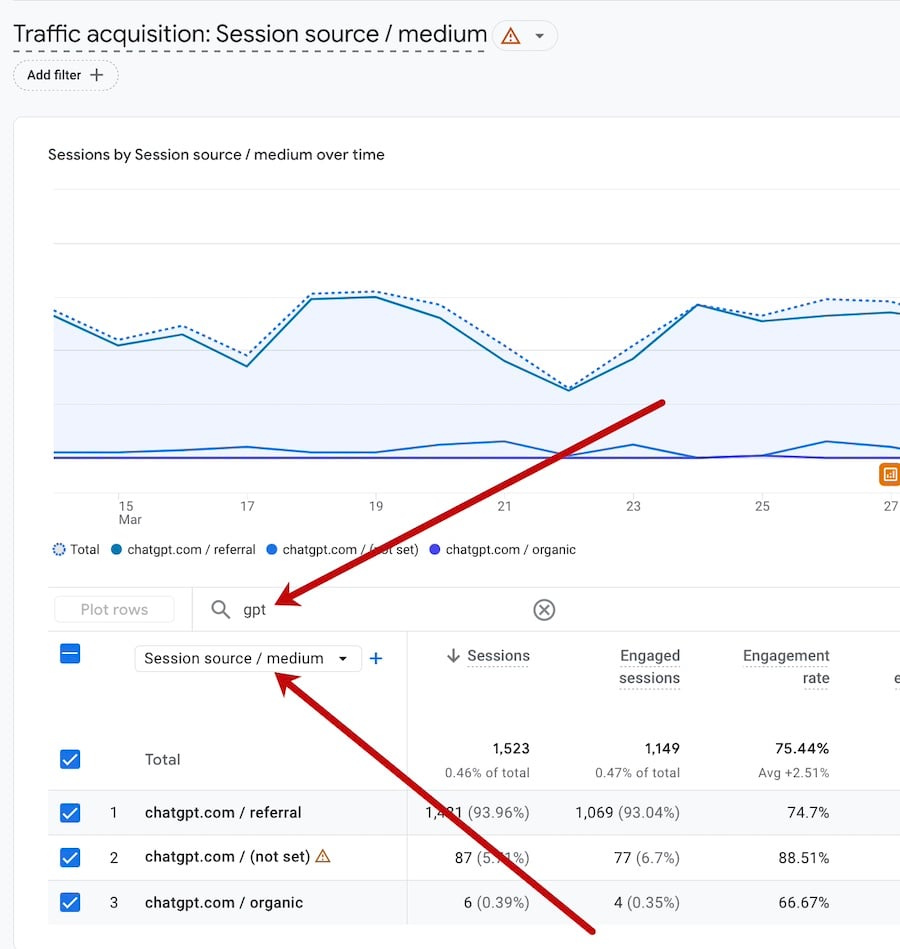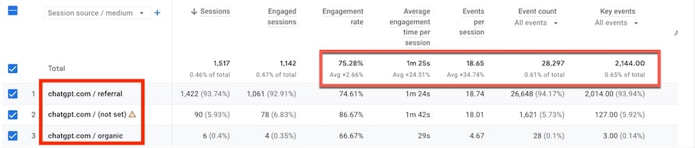 ChatGPT is becoming a valuable traffic source. It may not appear in a Google Analytics 4 overview because the volume is small, but ChatGPT traffic is often the most engaging source, even more than organic search.