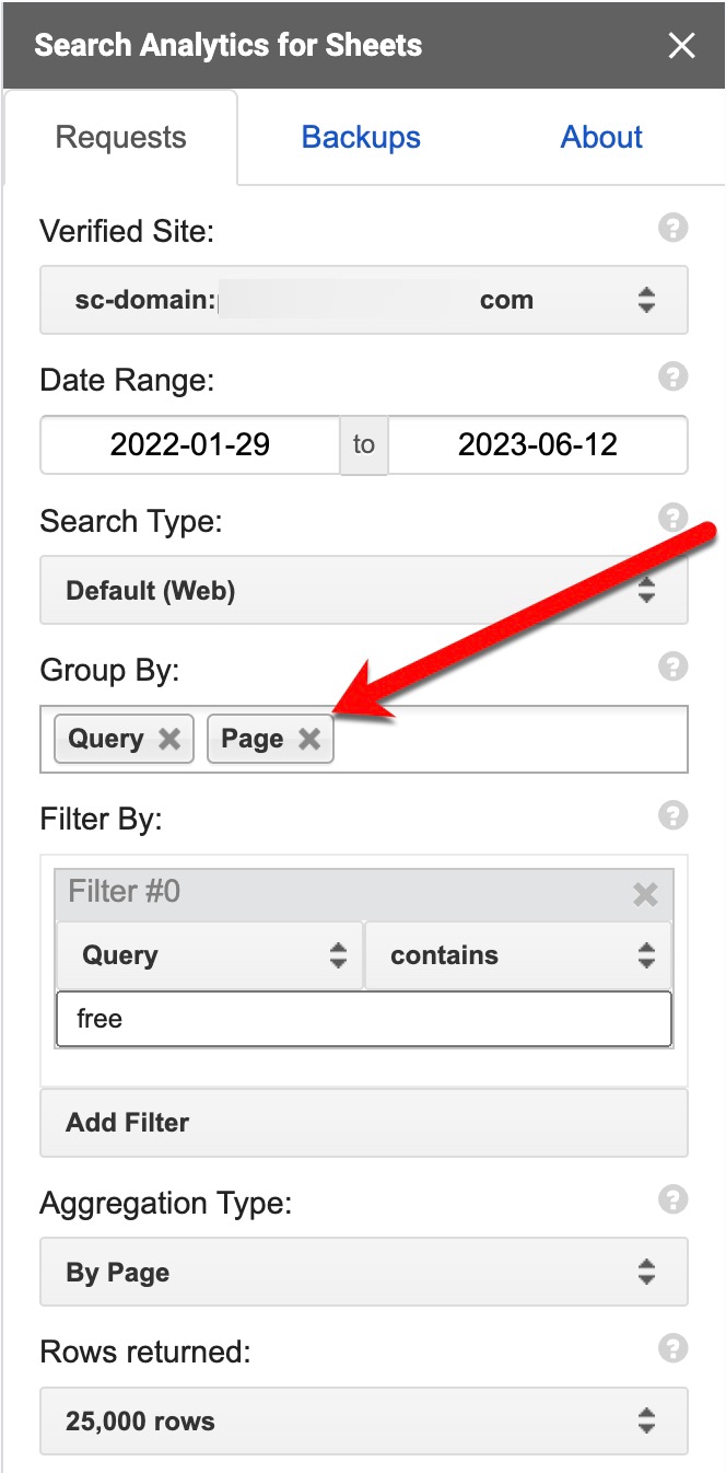 - Select the date range and add “Query” and “Page” in “Group by.”