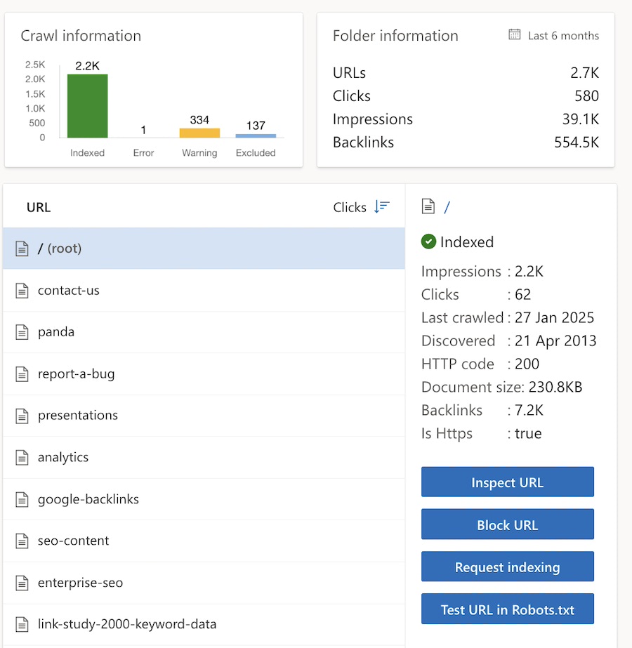 Site Explorer shows a site’s structure as experienced by Bing’s crawlers. Users can block or request indexing for any folder, see when each was last indexed, and obtain performance stats.