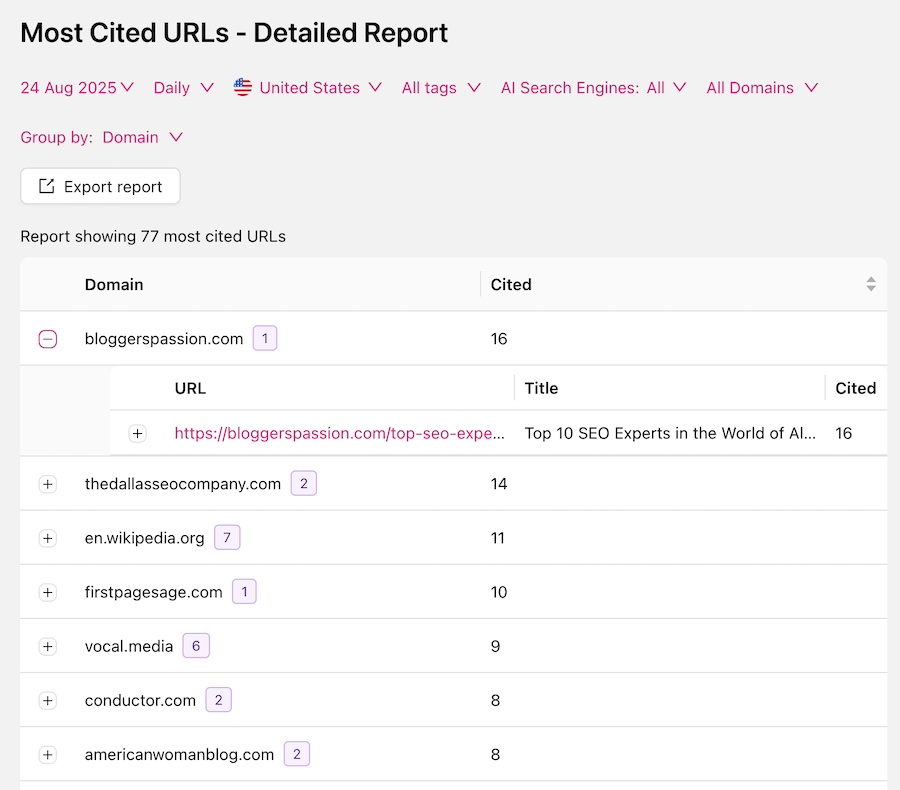 Third-party tools can help by running the prompts and generating citation reports. For example, Otterly.ai creates a consolidated report of “most cited domains” based on your tracked prompts. The report shows results from ChatGPT, Perplexity, Microsoft Copilot, and Google’s AI Overviews, revealing the overlapping citations.