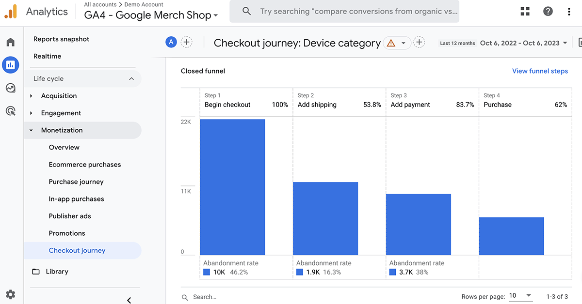 The Google Analytics 4 purchase journey report shows the funnel from when a would-be customer starts a web session through purchase. And the newer checkout journey report displays the checkout funnel in four detailed steps.