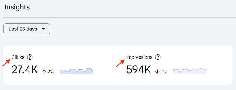 “Insights” shows just two organic search metrics: clicks and impressions.