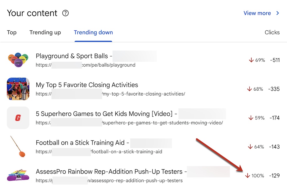Pages that lost 100% of clicks could have a technical glitch, requiring a quick “URL inspection” to confirm indexation.