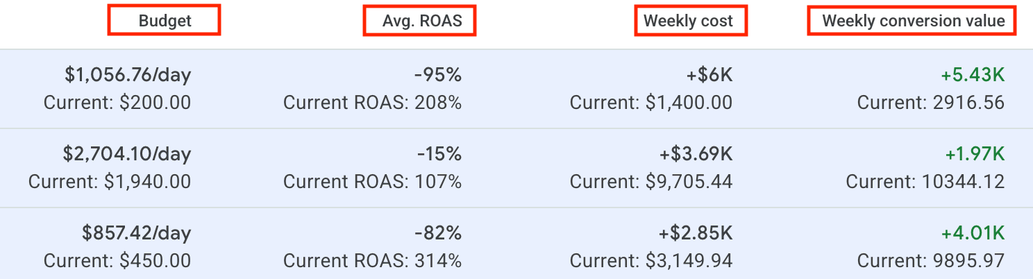 Choose which campaign changes are appropriate, as many likely won’t apply. The example below showcases the projected changes to “Avg. ROAS” and “Weekly conversion value” from Google’s recommendations.