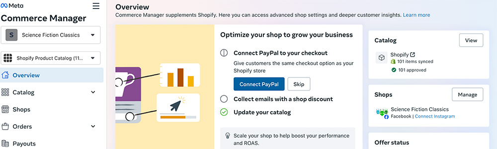 Once the Shopify store and Facebook Shop are synchronized, customize the latter via the Facebook Commerce Manager, adding payment types, layout, and verifications. Facebook permits some shop customization but will also pull from Shopify.