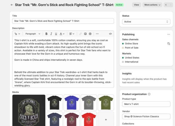 I edited this verbose product name to “Star Trek ‘Mr. Gorn’s Stick and Rock Fighting School’ T-Shirt.”