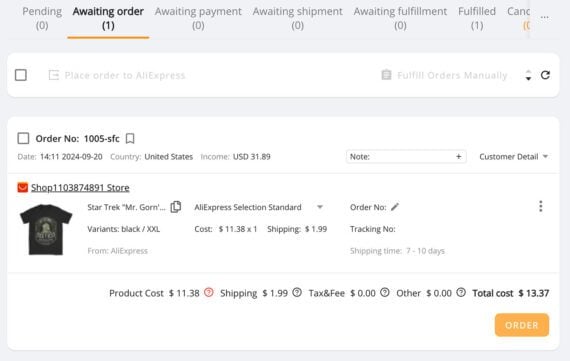 After completing the sale, the merchant orders the item on AliExpress via DSers. The default setting in DSers is to pay individually for each item in two steps — order it and then pay for it on AliExpress.