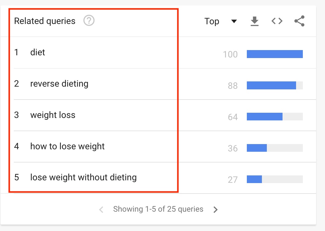 Google Trends’ “Related queries” shows the terms folks search for after the core keyword. Click image to enlarge.