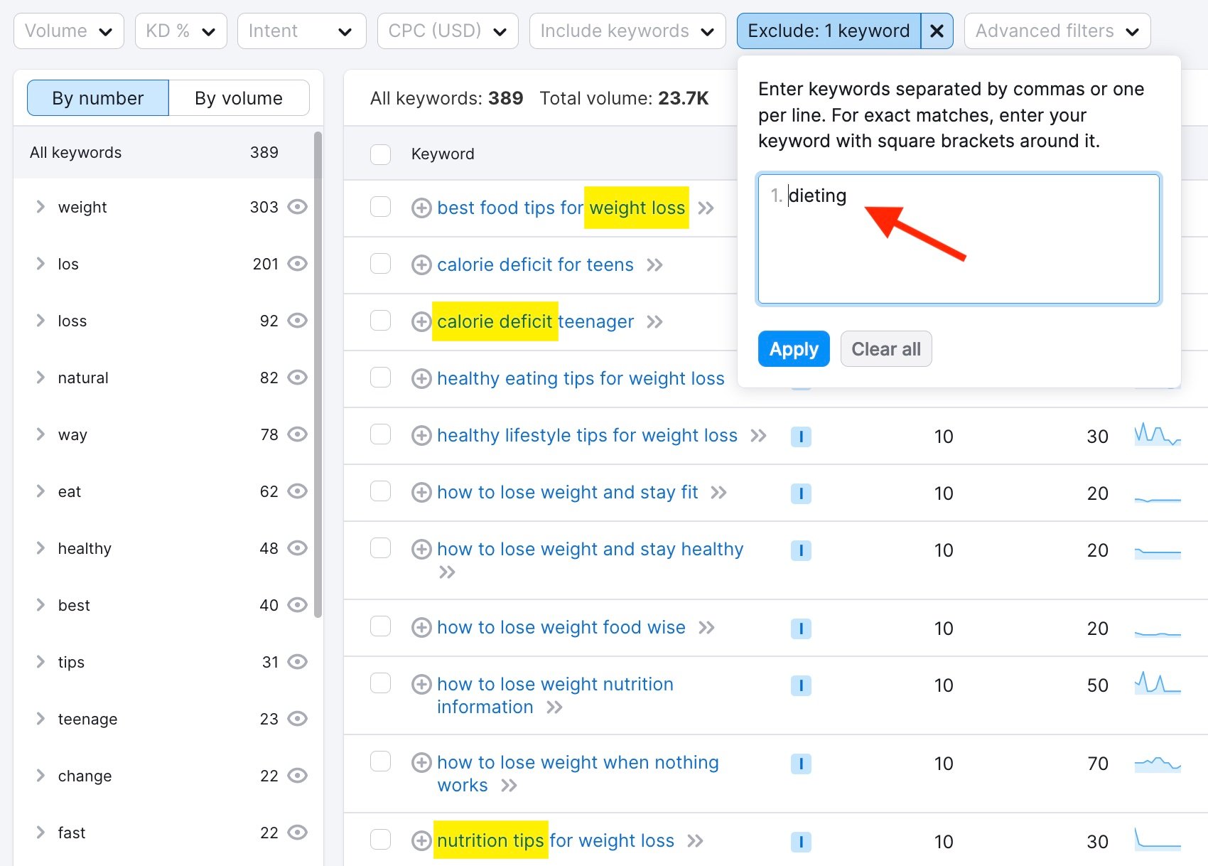 Semrush also shows, on the left (below), search trends around the related keywords. For “dieting,” the trends include “natural,” “teenage,” and “change.” Clicking any of them generates yet another list of related keywords from that trending term.