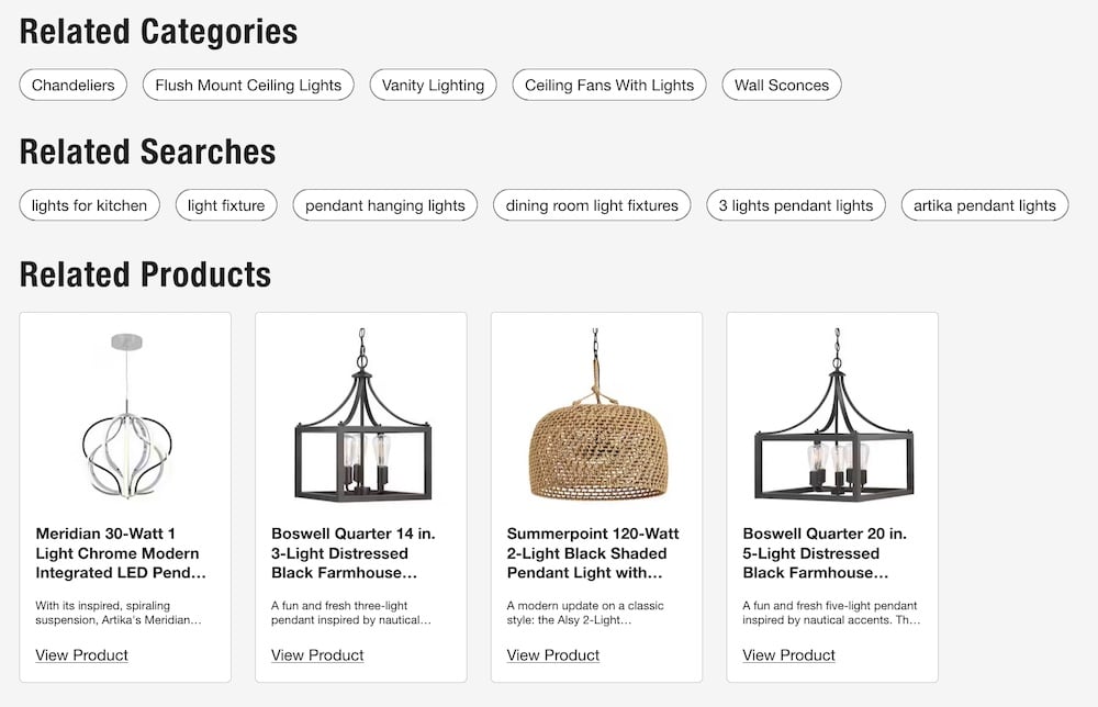 For example, Home Depot links to related categories, searches, and products on each category page.