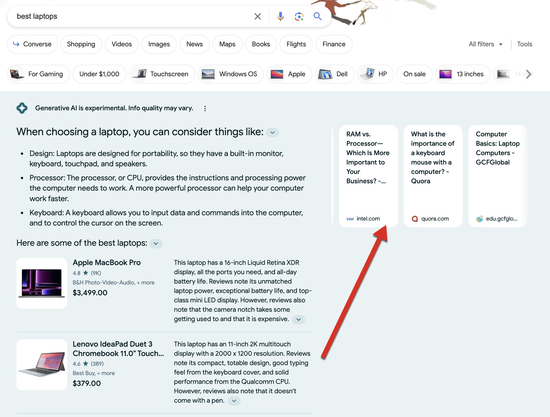 Moreover, SGE answers don’t always answer the query. For example, searching for “best laptops” in SGE includes results such as: